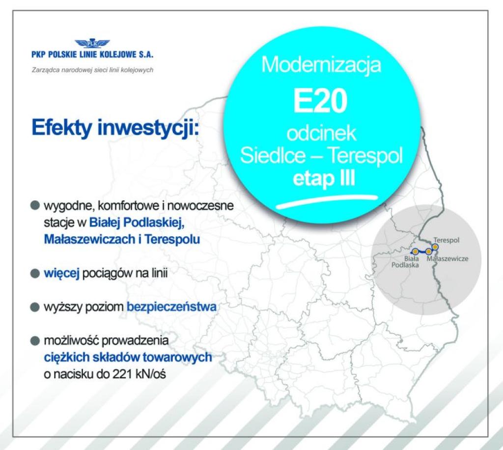 Wzrośnie komfort podróży koleją. Na peronach w Białej Podlaskiej, Małaszewiczach i Terespolu oraz przystanku Biała Podlaska Rozrządowa pojawią się nowe wiaty, wygodne ławki, oznakowanie, oświetlenie i tablice informacyjne. Zamontowany zostanie nowoczesny system nagłośnienia, a nad bezpieczeństwem czuwać będą kamery monitoringu. Wszystkie obiekty dostosowane będą do potrzeb osób o ograniczonych możliwościach poruszania się. W Małaszewiczach i Terespolu windy ułatwią pasażerom dotarcie do peronów, natomiast w Białej Podlaskiej zbudowany będzie wygodny podjazd.