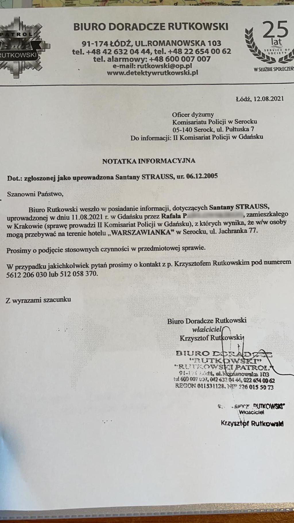 15-latka została odnaleziona w Hotelu Warszawianka w Serocku. To właśnie to miejsce dziś po godz. 15:00 wskazał Policji Krzysztof Rutkowski w oficjalnej notatce. Przesłał ją do Oficera Dyżurnego Komisariatu Policji w Serocku