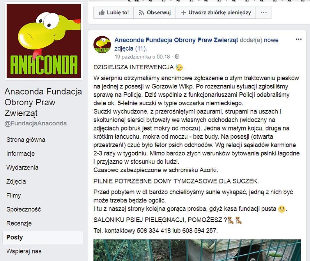 Informacje o interwencji podała Anaconda Fundacja Obrony Praw Zwierząt z Gorzowa Wielkopolskiego. Ta organizacja przeprowadziła 19 października razem z policją akcję odbioru wycieńczonych zwierząt.
