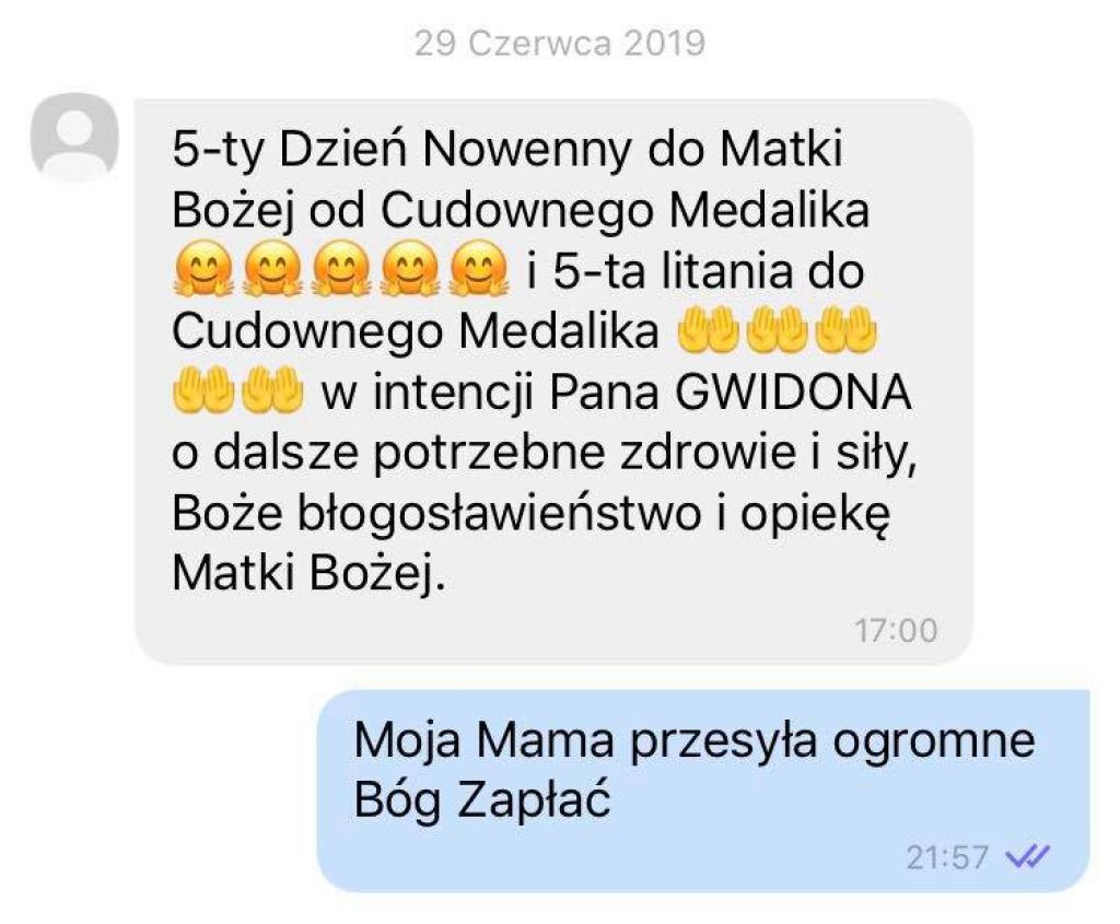 - Następnie otrzymałem SMS-y od Księdza Piotra Skóry, że rozpoczyna 9-dniową Nowennę do Matki Bożej od Cudownego Medalika wraz z Litanią do Cudownego Medalika w intencji Pana Gwidona - przekazuje syn chorego.