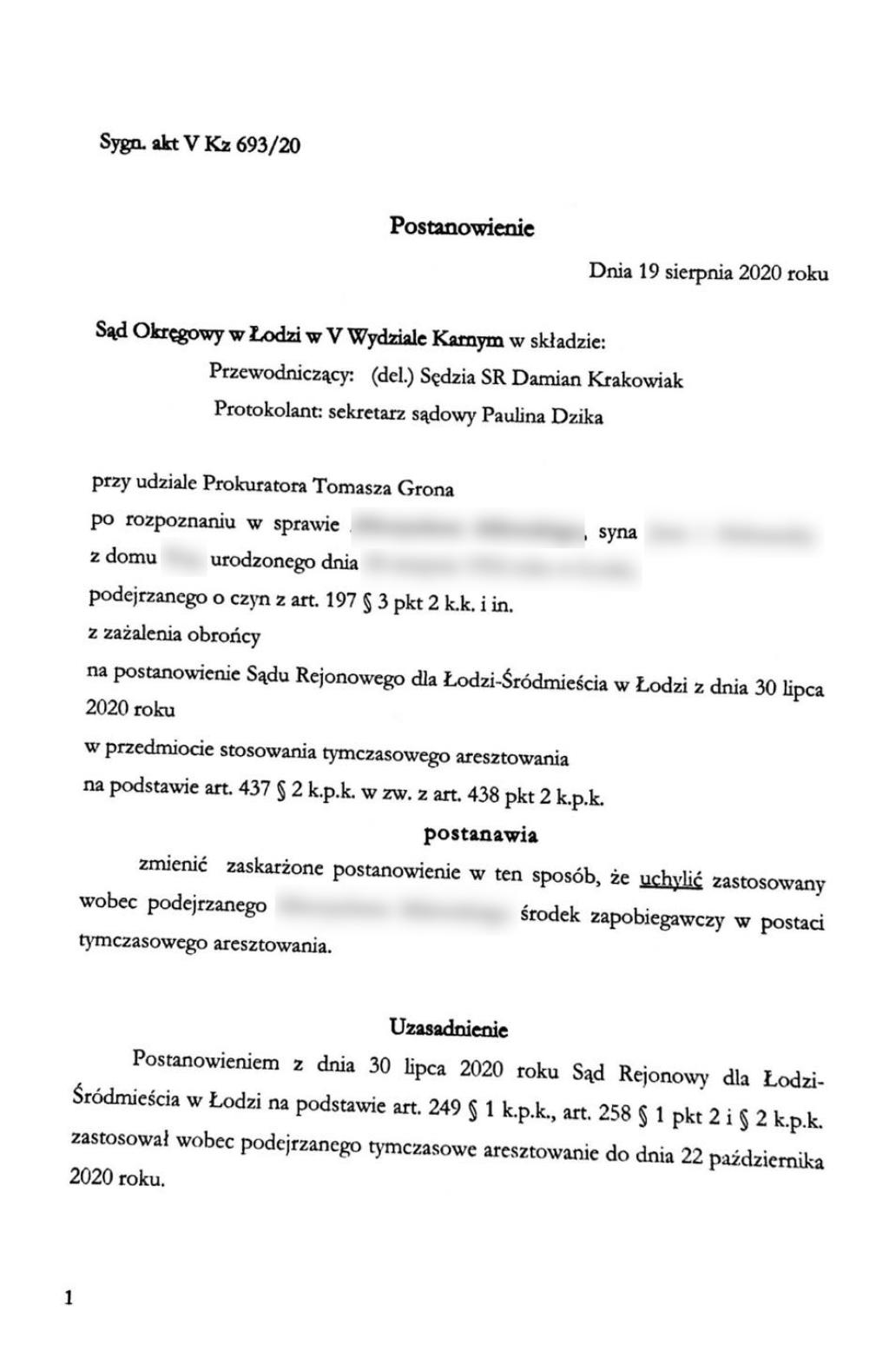 Dotarliśmy do postanowienia, które rzeczywiście wydał sędzia Damian Krakowiak w dniu 19 sierpnia 2020 roku. (Sygn. V Ks 693/20).