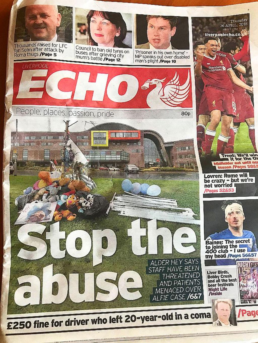 Tymczasem "Liverpool Echo" nie skupia się na życiu dziecka tylko na... rzekomych niedogodnościach zgłaszanych przez personel! W artykule pt. "Stop nadużycionm" (Stop the abuse) gazeta pisze, że szpital Alder Hey skarży się, że lekarze ponoć czują się zagrożeni bo pacjenci grożą im śmiercią! Całość w związku z zainteresowaniem mediów z całego świata oraz mieszkańców Liverpoolu zaangażowanych w obronę życia chłopca!