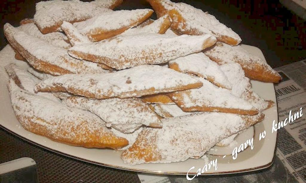 Mąkę mieszamy z proszkiem, dodajemy masło i delikatnie rozcieramy w dłoniach. Następnie dodajemy jajka i mleko i zagniatamy ciasto. Przykrywamy je ściereczką i zostawiamy na 10 minut. Po tym czasie stolnicę posypujemy delikatnie mąką i rozwałkowujemy ciasto na grubość ok. 0,5 cm, a następnie kroimy w romby. Po ok. 5 minutach wkładamy tawa - tawas na rozgrzany tłuszcz i smażymy na złoty kolor. Osączamy na ręczniku papierowym, a następnie obficie posypujemy cukrem pudrem.