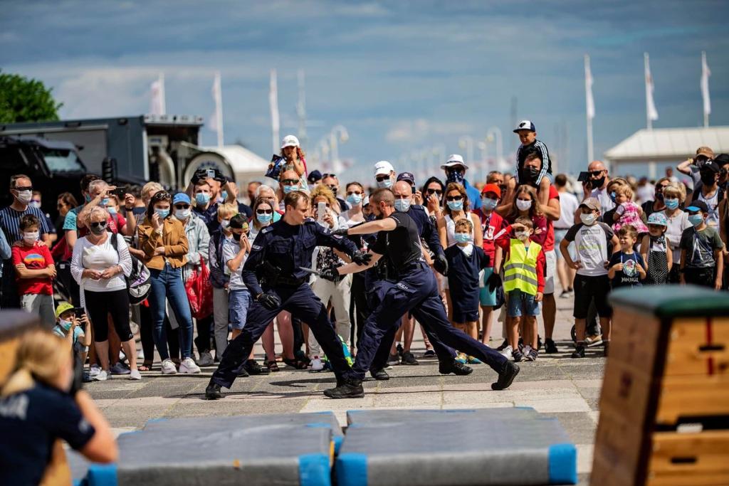 Patrolowali też teren wydarzenia i rozdawali maseczki wspólnie z funkcjonariuszami Oddziału Prewencji KWP w Gdańsku. Ci ostatni przygotowali też pokaz sprzętu służbowego, zwiedzający mogli zobaczyć wyposażenie funkcjonariuszy oraz np. potrzymać policyjną tarczę używaną w trakcie zabezpieczeń m.in. imprez masowych.