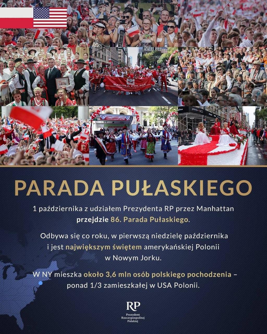 Prezydent Andrzej Duda wspólnie z Rodakami mieszkającymi w Stanach Zjednoczonych przeszli dziś główną aleją Manhattanu – słynną 5th Avenue w 86. Paradzie Pułaskiego. Był to pierwszy w historii udział urzędującego Prezydenta RP w tym nowojorskim wydarzeniu.