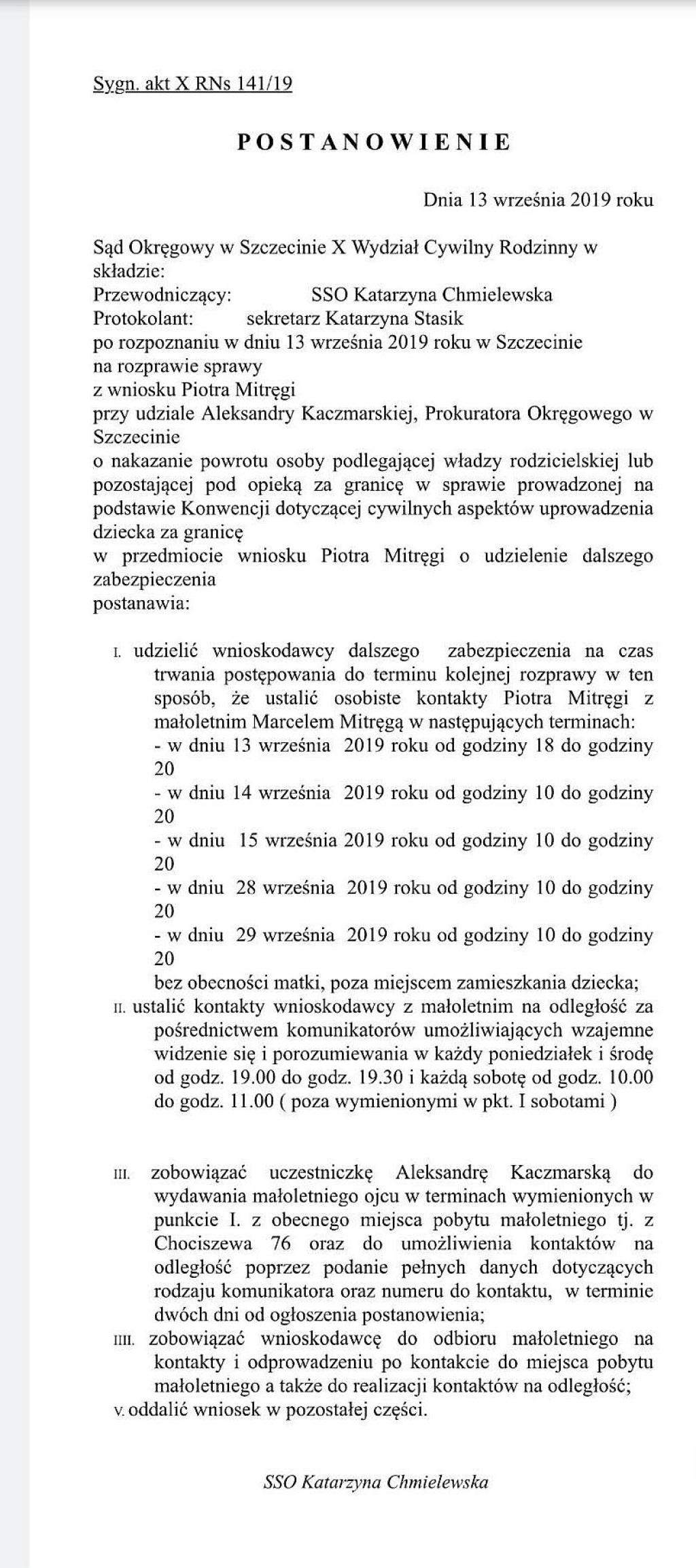 Zwrócili się wówczas o ustanowienie kontaktu z Marcelem do czasu wydania w dniu 4 października 2019 r. decyzji wynikającej z Konwencji Haski, którą złożył w Wielkiej Brytanii celem rozpatrzenia właśnie przez Sąd Okręgowy w Szczecinie Piotr Mitręga. Uzasadniał to, że on jest taki biedny, stęskniony i chciałby zgodnie z prawem spędzić czas samodzielnie z synkiem w Polsce.
