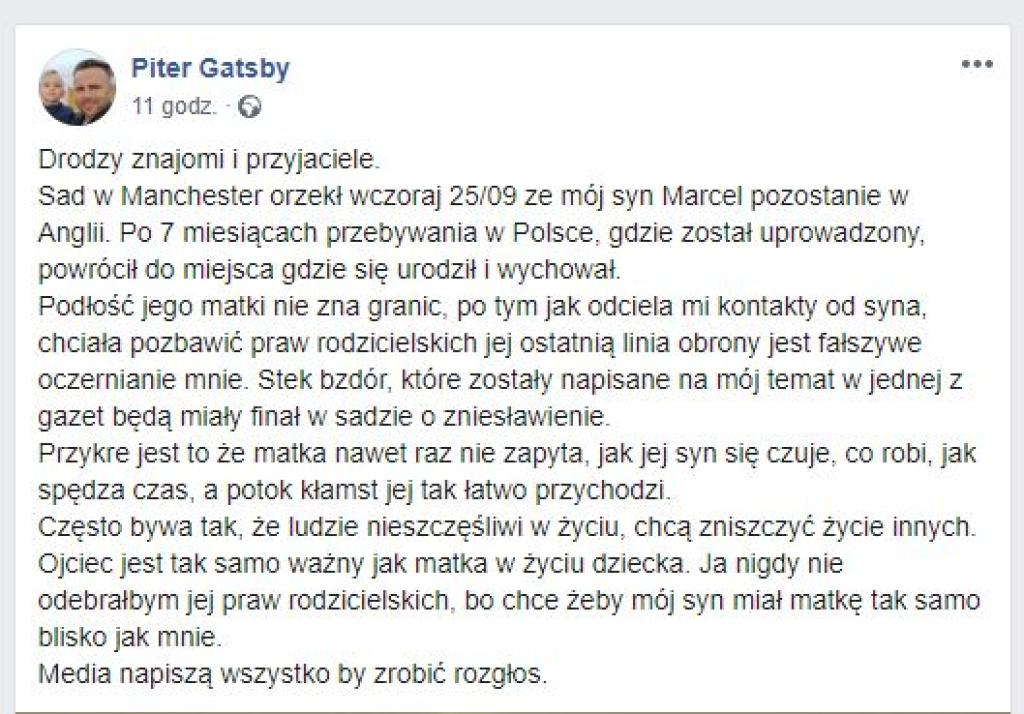 - Piotr Mitręga kreuje się wśród znajomych jako pokrzywdzony, dzielny, biedny tatuś. Który chce zatrzymać dziecko przy sobie w Wielkiej Brytanii by rzekomo zapewnić mu piękną przyszłość. Bo Manchester taką przyszłość rzekomo gwarantuje - przekazuje Aleksandra Kaczmarska.