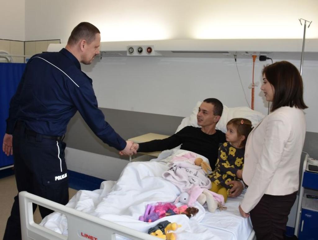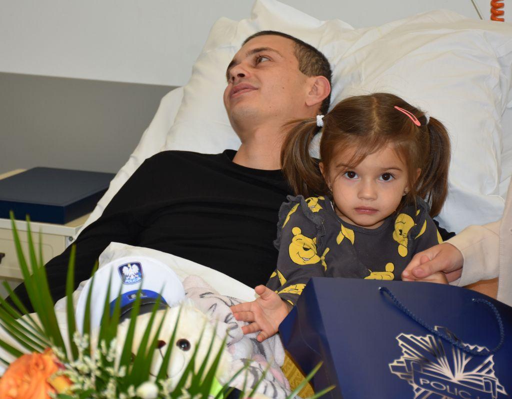 Dzisiaj, Komendant Główny Policji nadinsp. Marek Boroń, I Zastępca Komendanta Wojewódzkiego Policji w Rzeszowie podinsp. Piotr Stępka oraz Komendant Powiatowy Policji w Jarosławiu podinsp. Jan Wojtowicz, spotkali się z rannym policjantem, jego żoną i córeczką Polą w Centrum Opieki Medycznej w Jarosławiu.