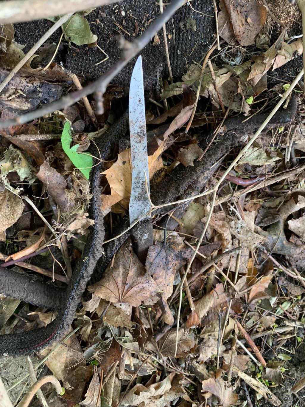 Jeden z noży jest ubrudzony ciemną cieczą.