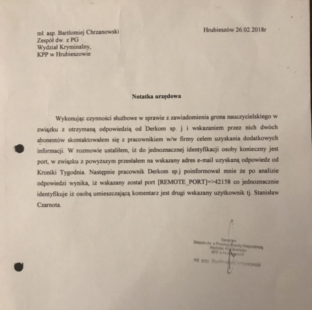 Wysokim stopniem profesjonalizmu wykazali się oficerowie kryminalni. Młodszy Aspirant Bartłomiej Chrzanowski w dniu 26.02.2018 roku ustalił, że wpis osoby podpisującej się jako "Rodzic" i wskazujący nauczycieli jako łapówkarzy pochodził z domu... wójta Stanislawa Czarnoty!