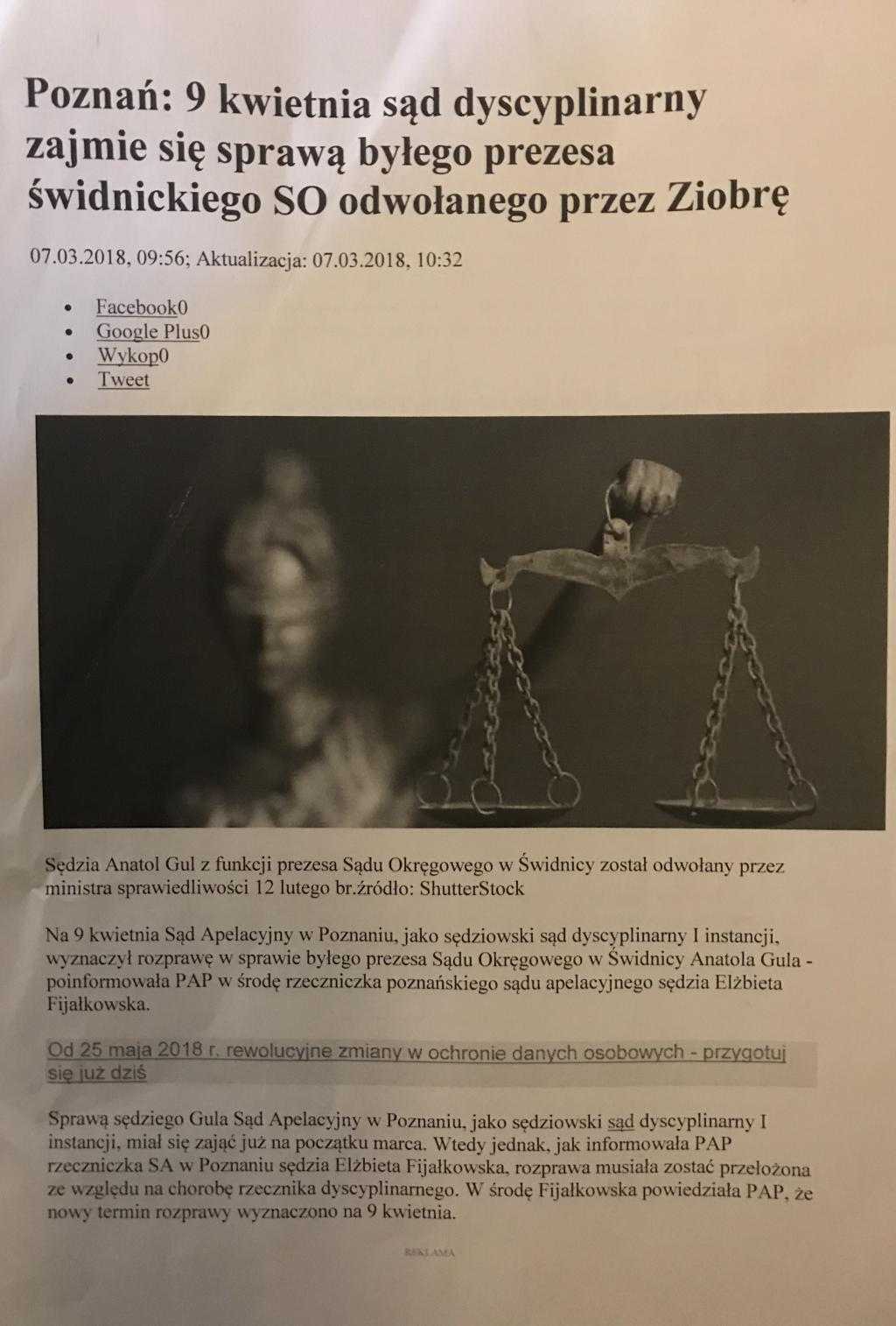 Przypomnijmy, że to nie pierwsza afera na wysokim szczeblu w Okręgu Świdnickim. Miesiąc temu został odwołany w trybie natychmiastowym Prezes Sądu Okręgowego w Świdnicy Anatol Gul. Dziś wiadomo już, że 9 kwietnia 2018 r. stanie on w Poznaniu przed Sądem Dyscyplinarnym. Chodzi o papiery wartościowe na kwotę 300 tysięcy złotych, których nie wpisał do swojego oświadczenia majątkowego.